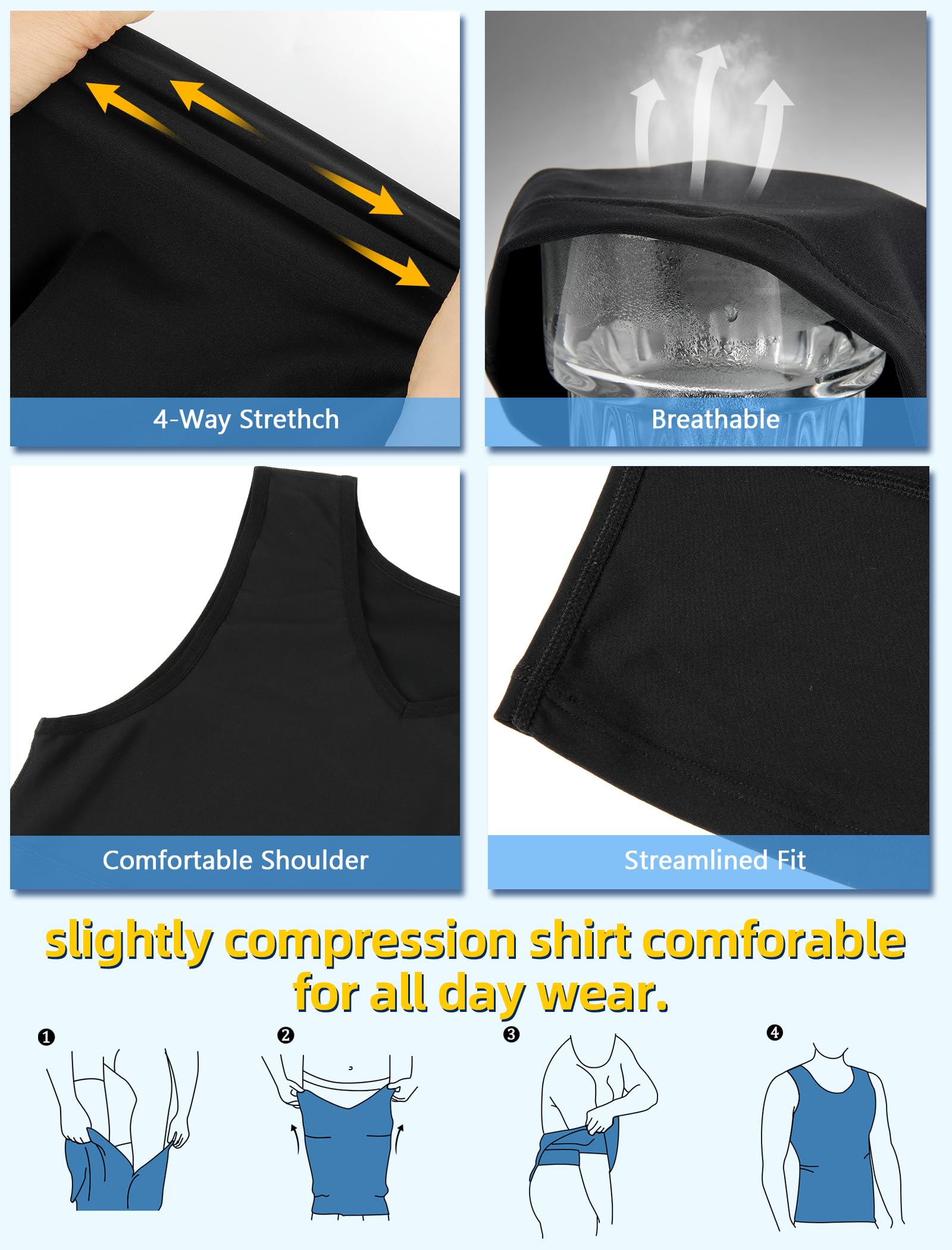- πͺ DOUBLE LAYER COMPRESSION SHIRT: Double layer panels mid-abdomen of men tights shirt provides optimal compression effect for the waist, fully wrapping your tummy, while nicely tightening the belly fat. Seamless body shaper features v neck sleeveless chest binder tank top on upper chest and back design hiding "man boobs" to prevents dew points and helping tighten back muscles to straighten your posture.