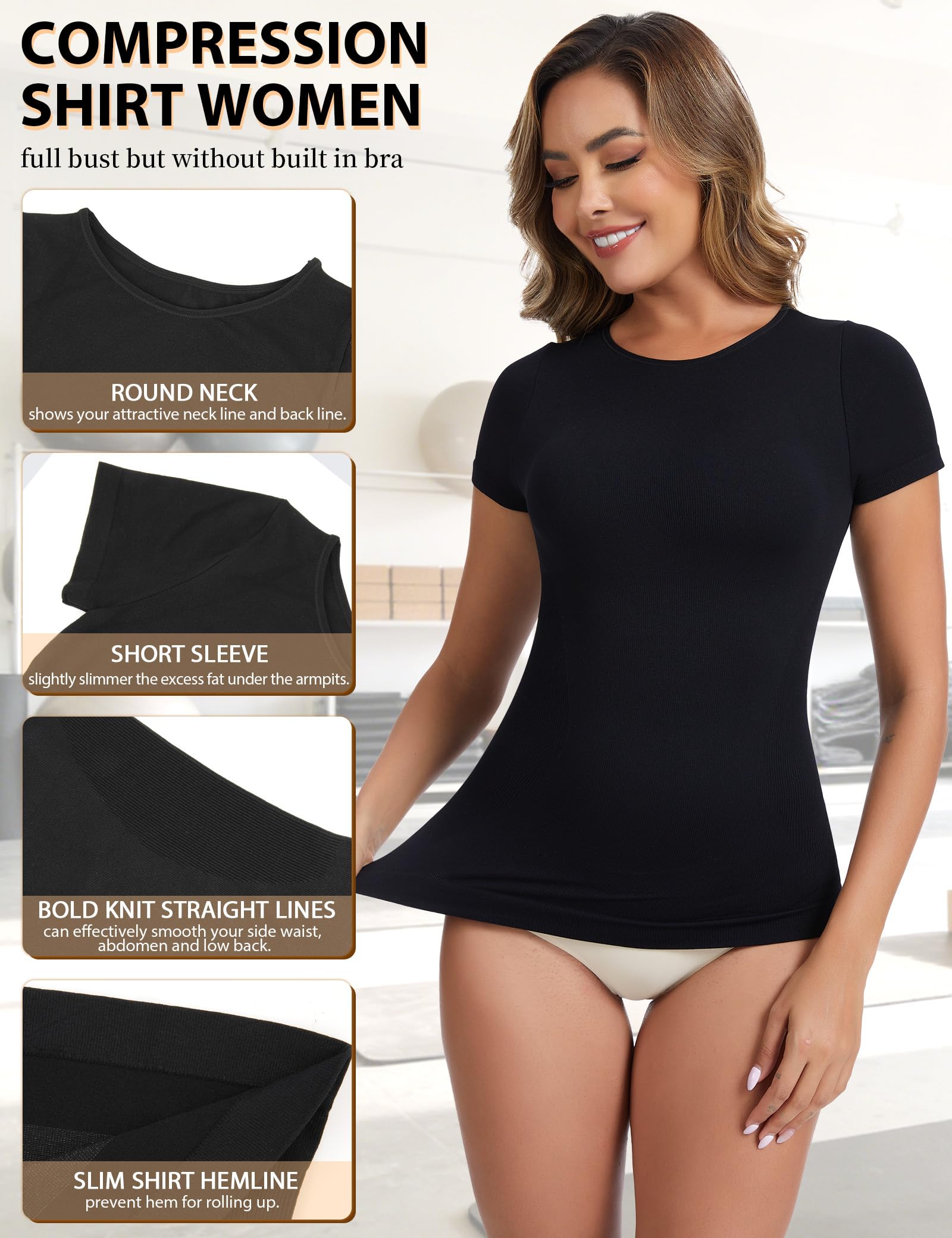 - 🌺 SHORT SLEEVE COMPRESSION SHIRTS: Women tops are feature with cap sleeve to slightly slimmer the excess fat under the armpits, scoop neck to beautify your neck line and shows your attractive back line in your sight, and the bold straight lines on the abdomen gently defines your waist and smooths your tummy. Undershirts for women design provides a neither too tight nor too loose compression to slim you down and shape your whole upper body, gives you a firm look instantly.